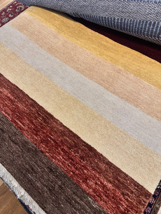 Fine Modern 5' x 6'5" Hand Knotted Wool Area Rug Stripes Colorful Warm India